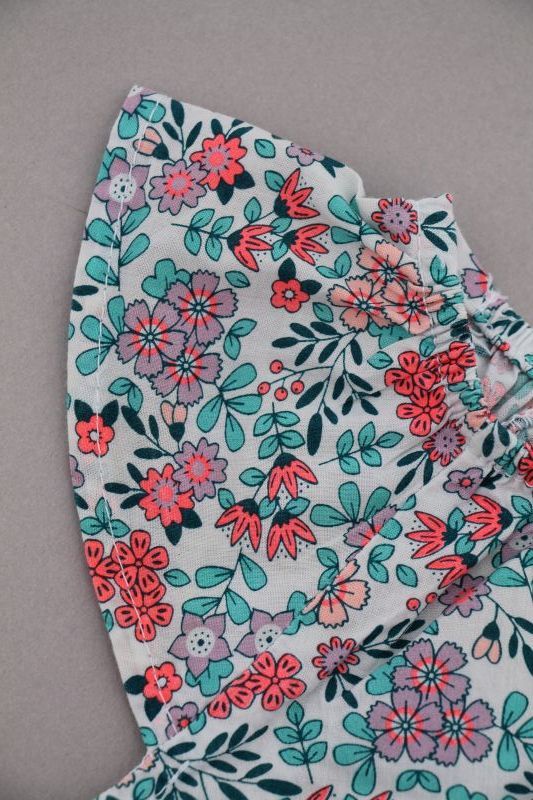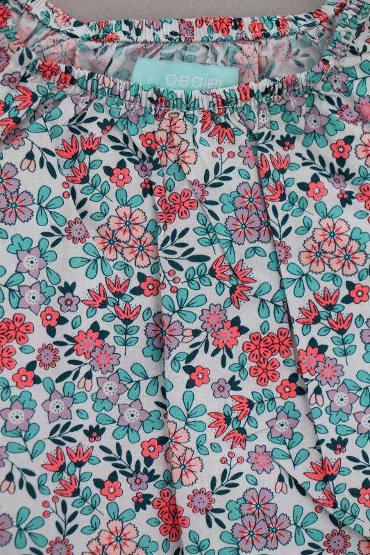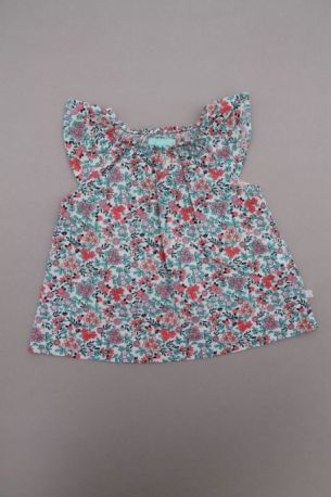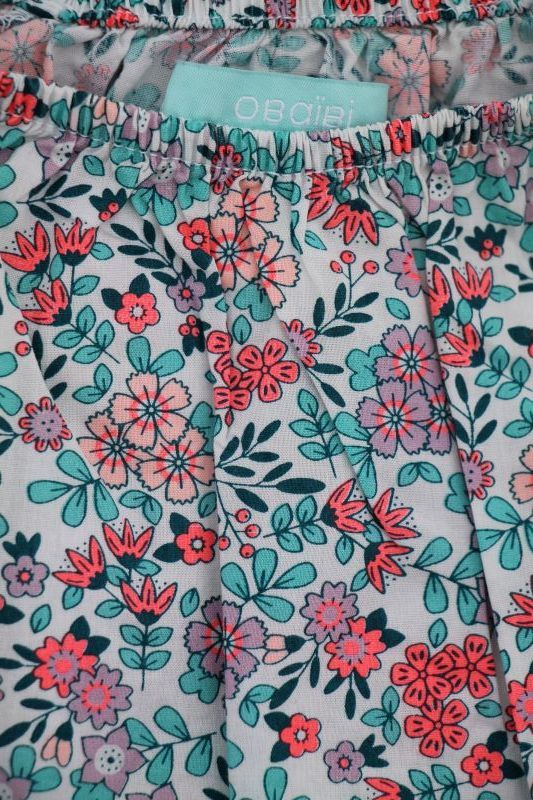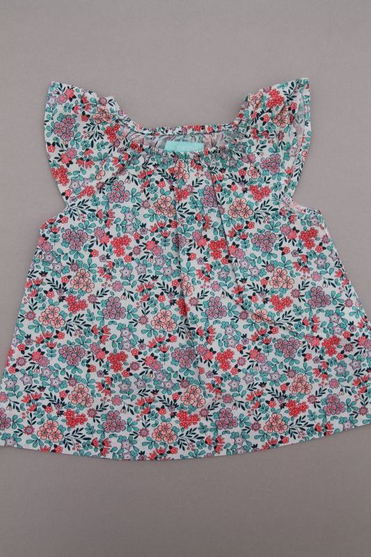 Ensemble 2 pièces, pour bébé fille 6 mois, très léger pour l'été, comprenant une blouse écru imprimé floral à manches papillon avec 5 boutons tout le long du dos et un short bloomer vert...
