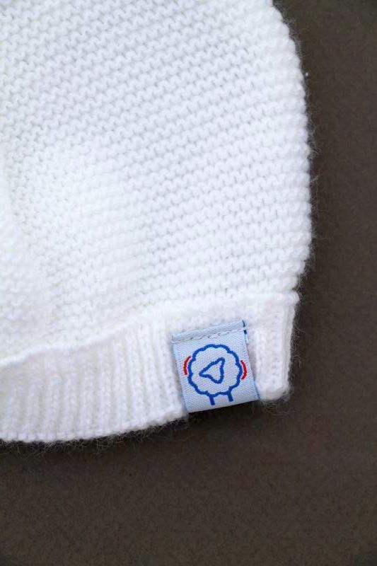 Brassière mixte en maille blanche tricotée en France, pour bébé 0 à 1 mois, chaude pour la maternité, avec fermeture croisée par un bouton et un cordon.