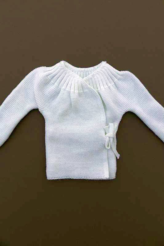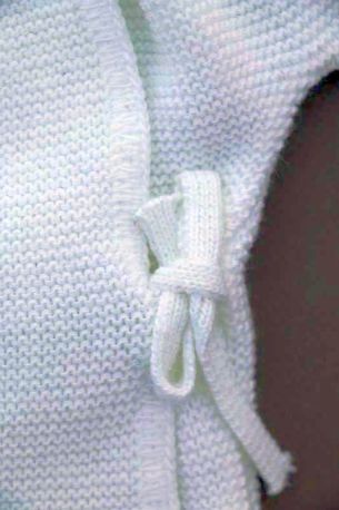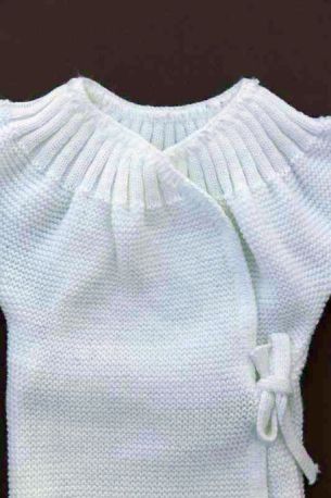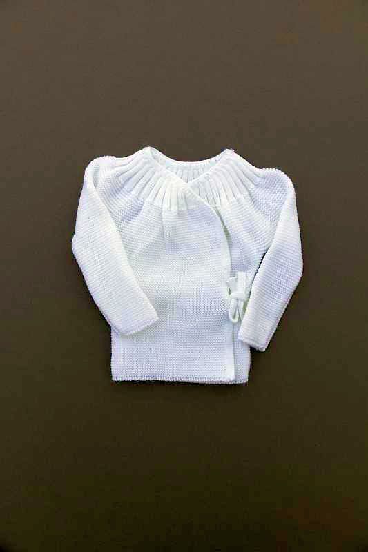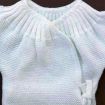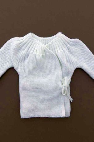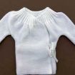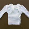 Brassière mixte en maille blanche tricotée en France, pour bébé 0 à 1 mois, chaude pour la maternité, avec fermeture croisée par un bouton et un cordon.