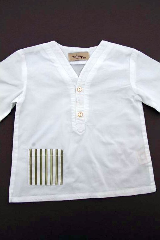Chemise à col Mao rayée bleu clair et blanc à manches longues, pour bébé garçon 6 mois, légère pour la mi-saison ou l'été, avec écusson bleu "TC" brodé côté coeur et 3 boutons sur la...