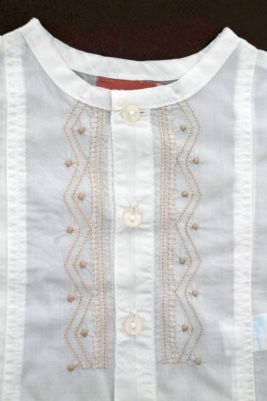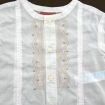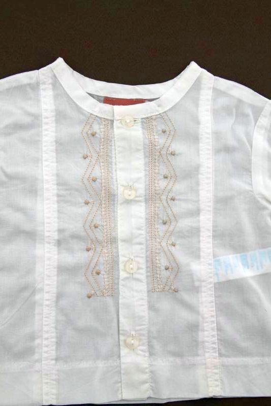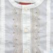 Chemise blanche aspect lin à col mao et manches longues retroussables, pour bébé garçon 3 mois, idéale pour une cérémonie au printemps ou l'été, avec fermeture pour 5 boutons.