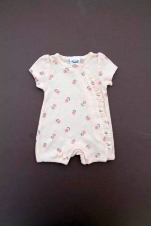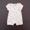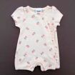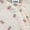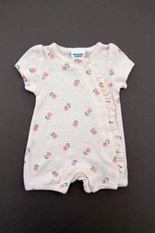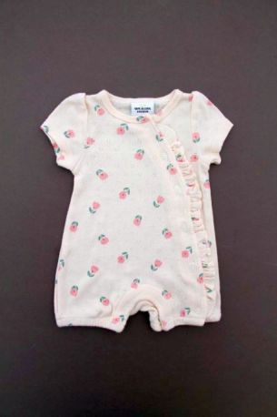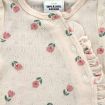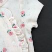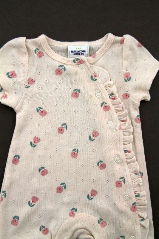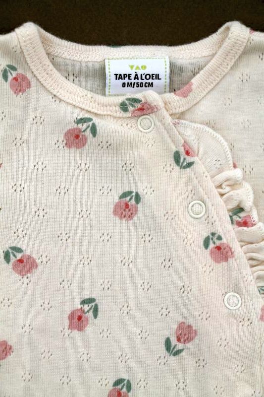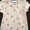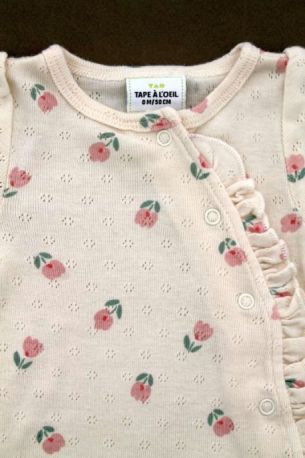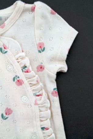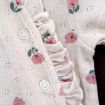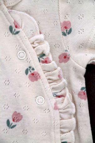 Gilet en tricot point mousse écru, pour bébé fille naissance, idéal pour un bébé de printemps ou d'été, avec bord rose imprimé floral et fermeture croisée devant.