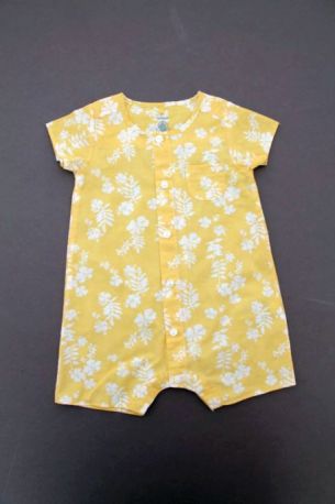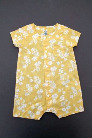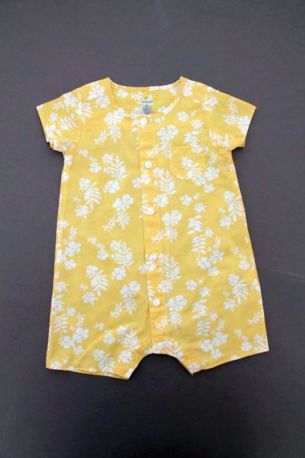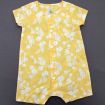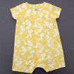 Combibloomer en jersey rose pale imprimé floral, pour bébé fille 3 mois, idéal pour l'été, avec collerette en popeline de coton corail, broderie oiseau doré et pressions au dos.