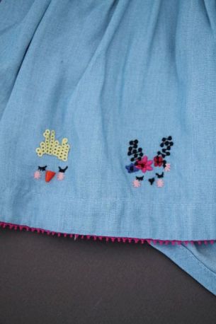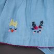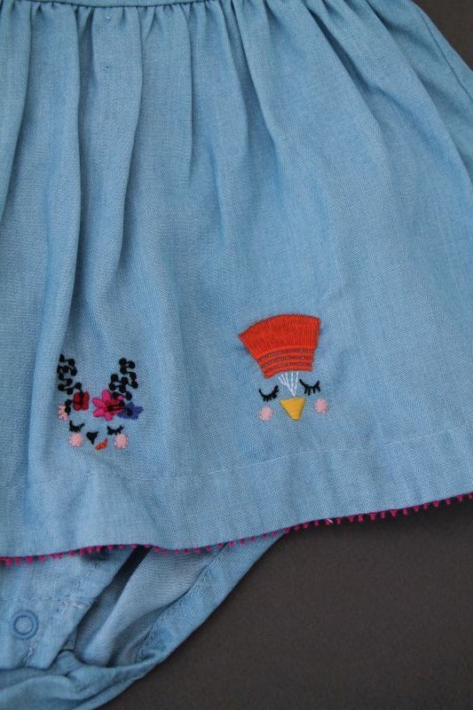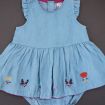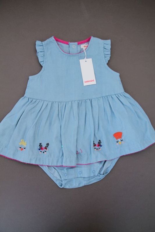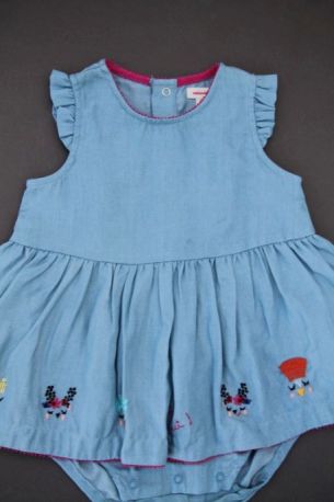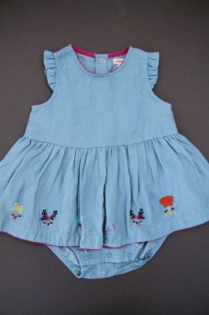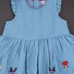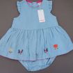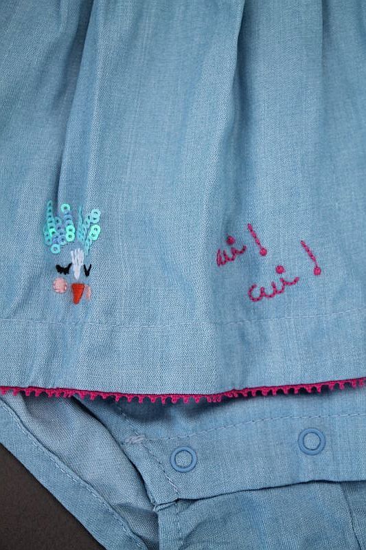 Robe bleu clair avec fleurs et papillons brodés, pour bébé 12 mois, légère pour l'été, avec ouverture zippée dans le dos pour faciliter l'enfilage.