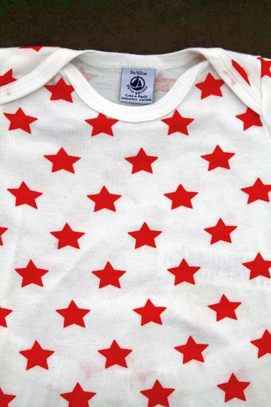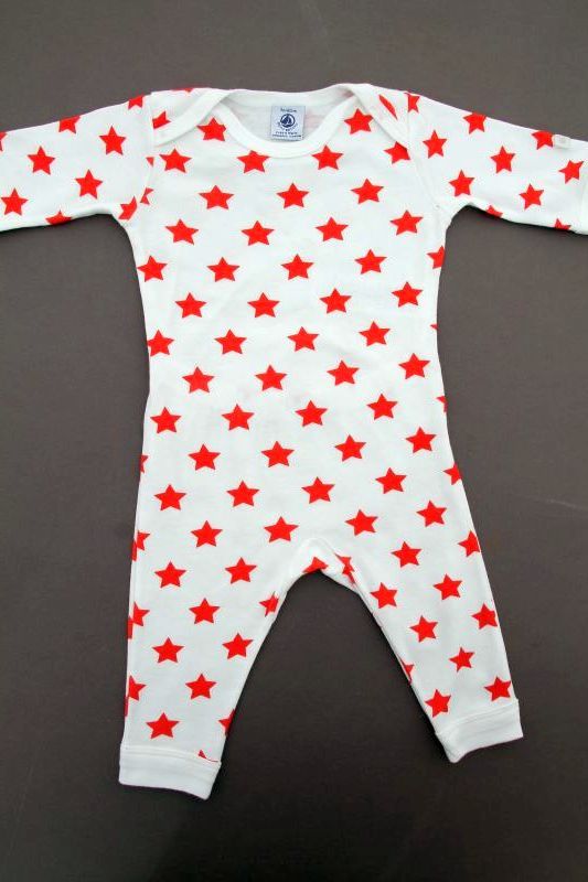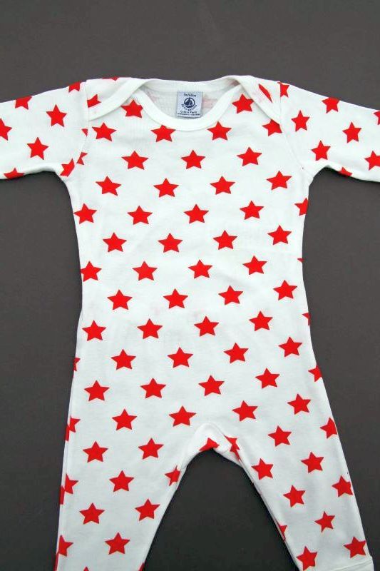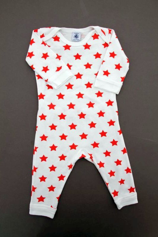 Dors-bien en jersey bleu marine imprimé étoiles blanches, pour bébé garçon 3 mois, très léger pour le printemps ou l'été, avec bord milleraies rouge et pressions devant et entre les jambes...
