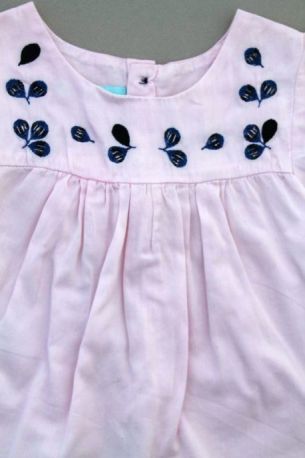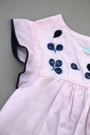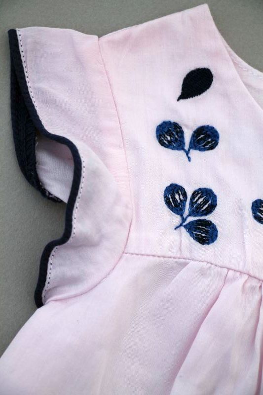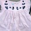 Robe en jersey doux et fin bleu-gris et rose rayé à manches courtes, pour bébé fille 12 mois, très confortable à porter, légère pour le printemps ou l'été, avec 2 boutons-pression blancs...