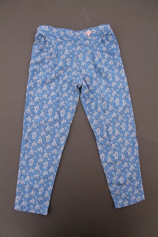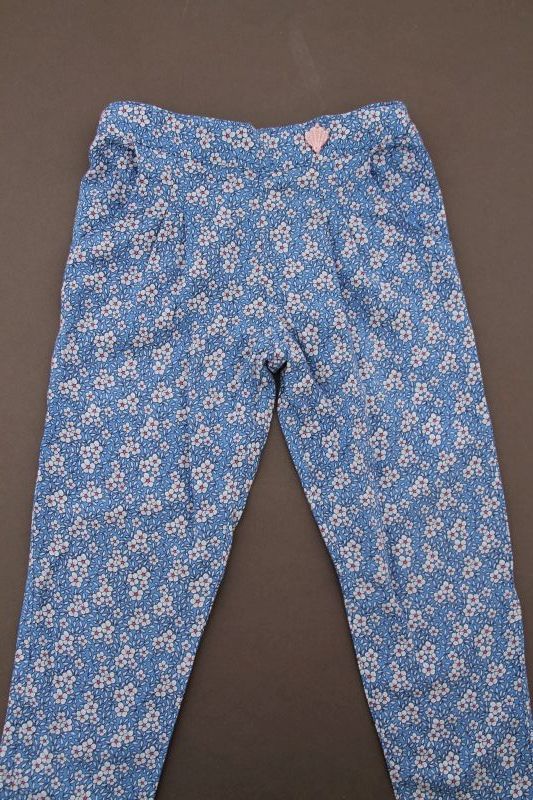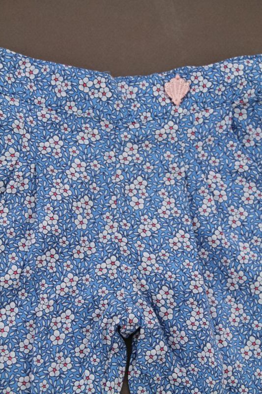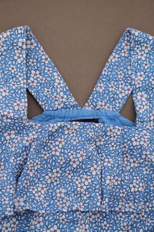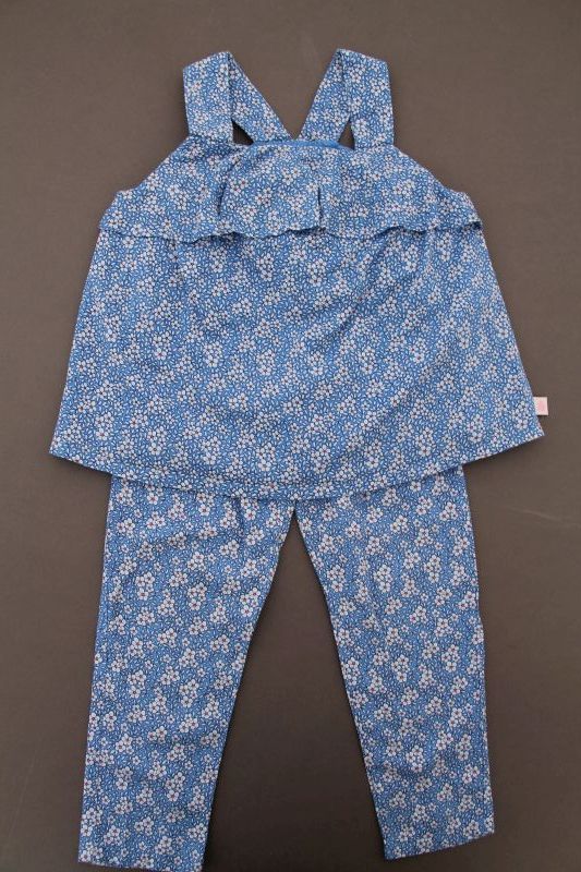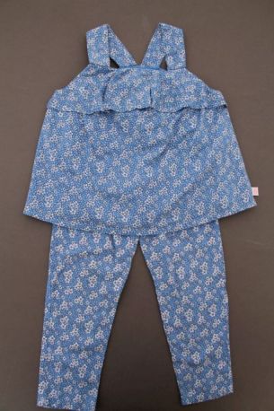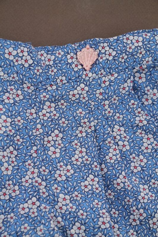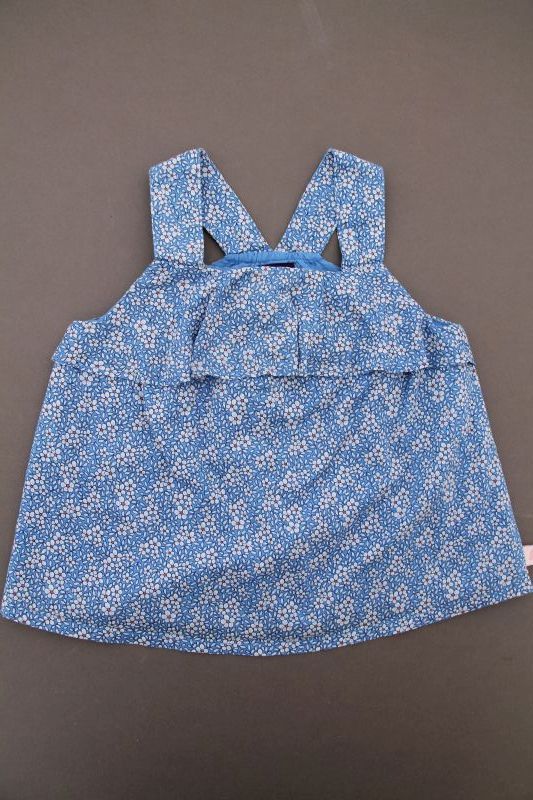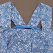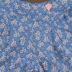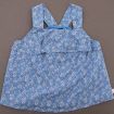 Blouse à col volanté en popeline blanche imprimée florale bleue, pour bébé fille 2 ans, très légère pour le printemps ou l'été, avec 5 boutons nacrés tout le long du dos pour facilité...