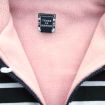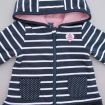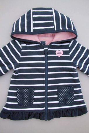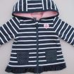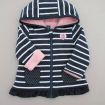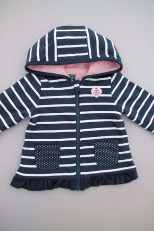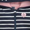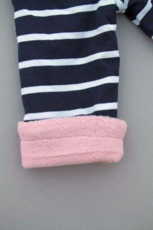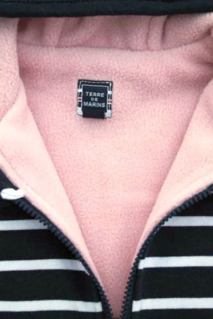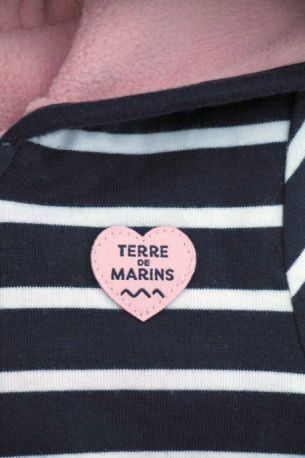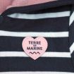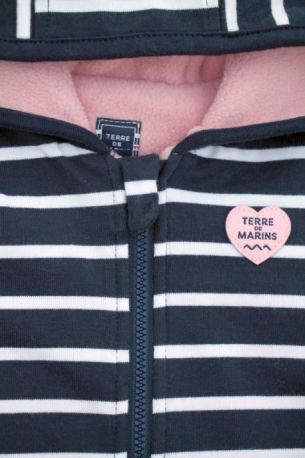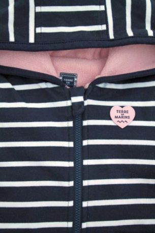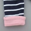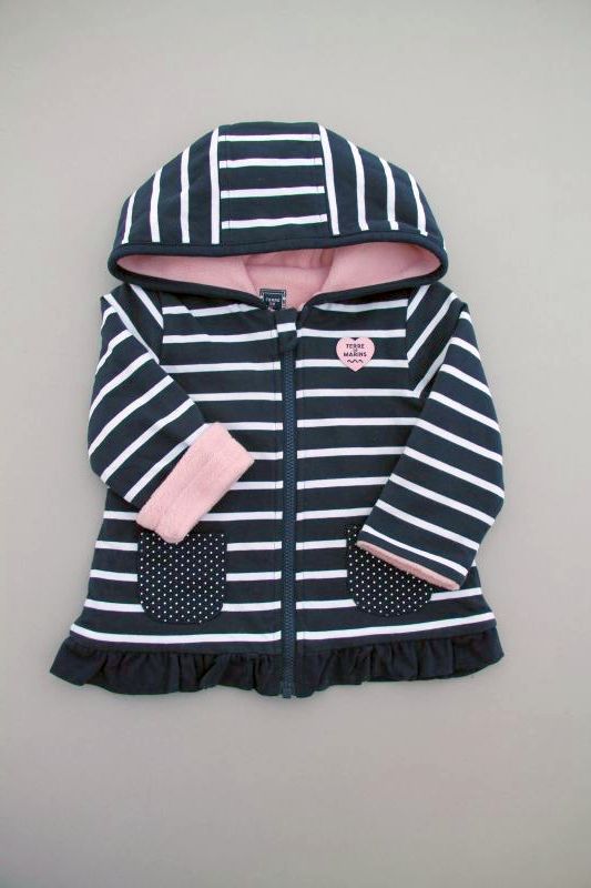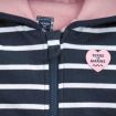 Sweatshirt écru rayé bleu marine avec coeur rose saumon sérigraphié, pour bébé fille 3 à 6 mois, chaud pour le printemps, avec un bouton dans le dos pour faciliter l'enfilage.