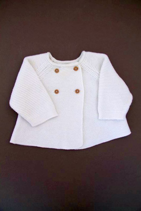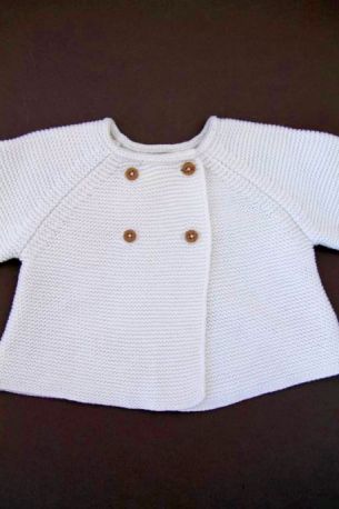 Gilet à capuche mixte en tricot fin écru, pour bébé 1 mois, chaud pour la mi-saison car entièrement doublé en jersey de coton, avec fermeture par 6 boutons nacrés.