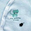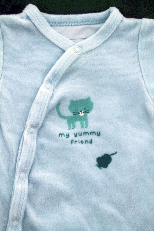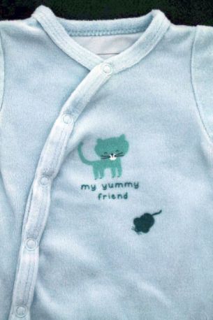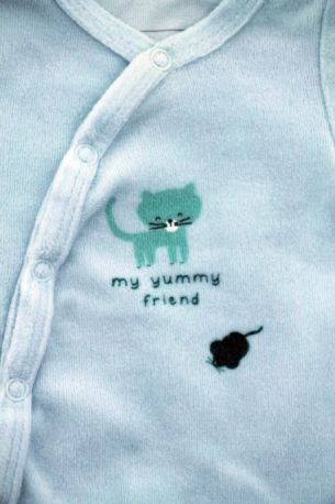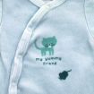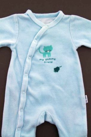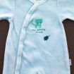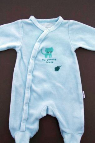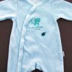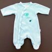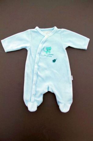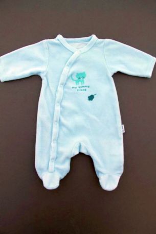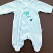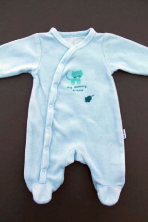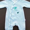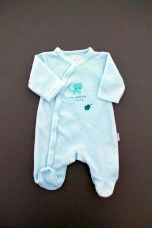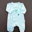Pyjama en velours bleu layette, pour bébé garçon prématuré (45 cm), avec pressions devant et entre les jambes pour faciliter l'habillage et le change.
