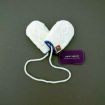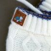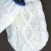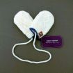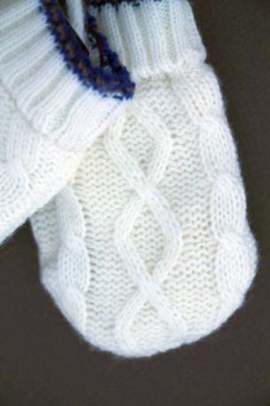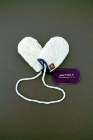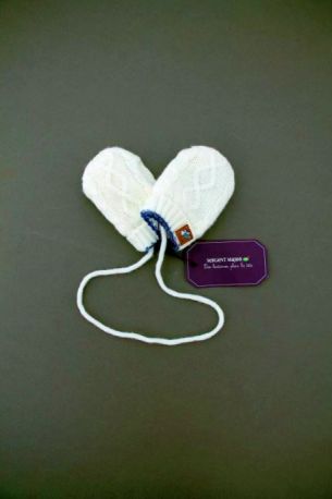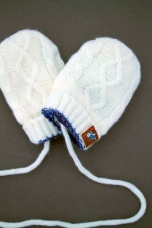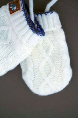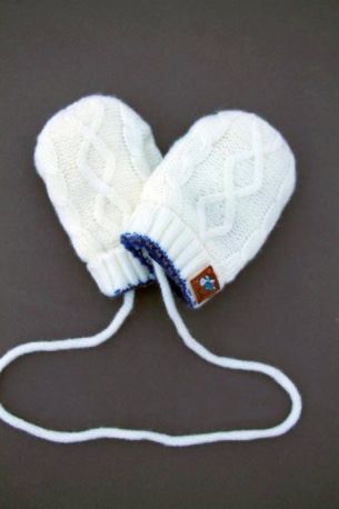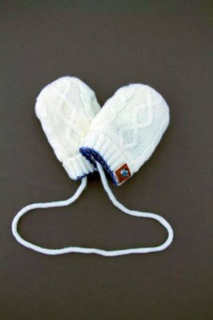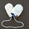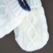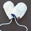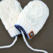 Moufles mixtes en tricot doux blanc rayé bleu marine, pour bébé 6 à 12 mois, très chaudes pour l'hiver car entièrement doublées polaire, avec cordon pour ne pas les perdre.
