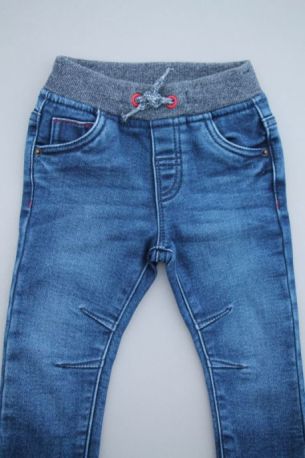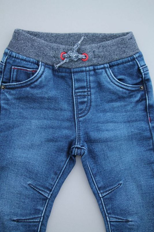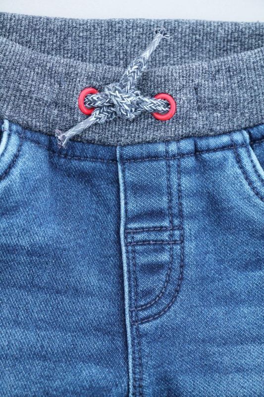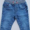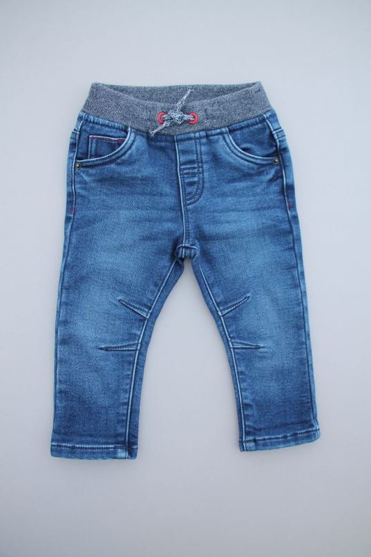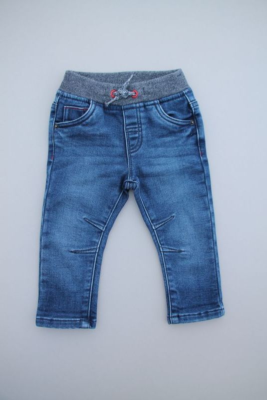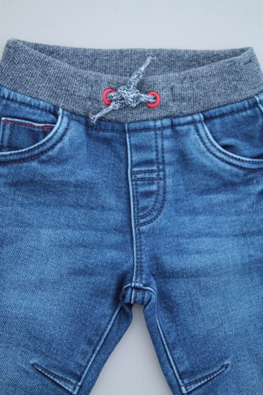 Pantalon en denim bleu foncé doublé, pour bébé garçon 12 mois, confortable à porter et bien chaud pour la mi-saison ou l'hiver, avec taille élastique et un bouton-pression devant.