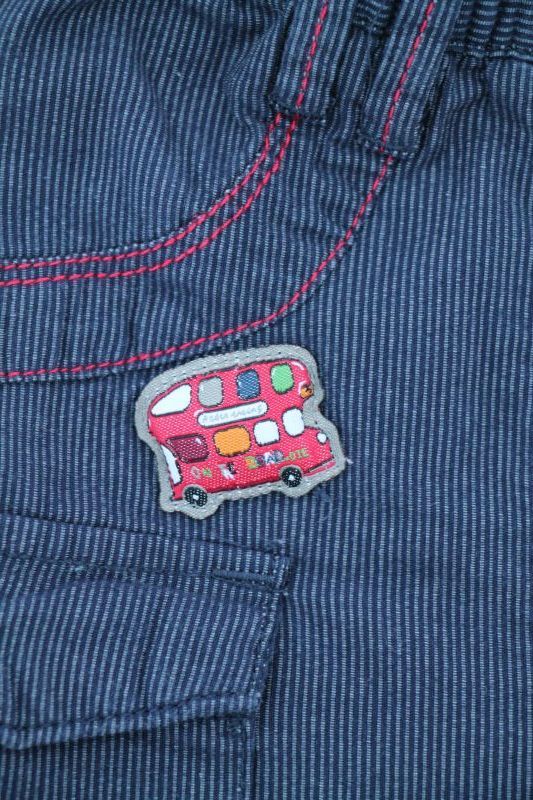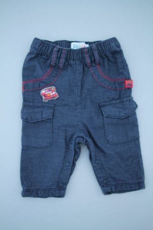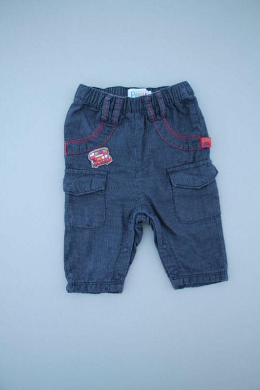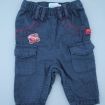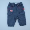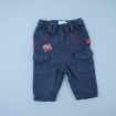 Pantalon en denim doux bleu sérigraphié, pour bébé garçon 3 mois, très souple et confortable à porter, idéal pour la mi-saison ou le printemps, avec écusson brodé, taille et bas...