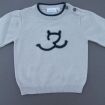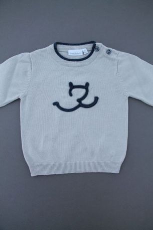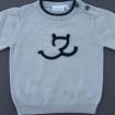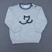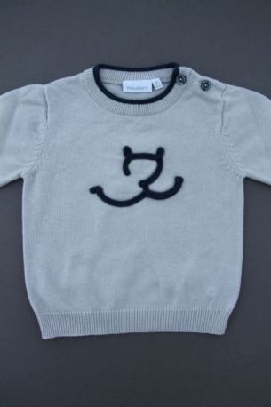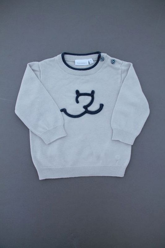 Pull en tricot doux tricolore bleu marine, jaune et gris clair chiné, pour bébé garçon 9 mois, chaud pour le printemps, avec 2 boutons sur l'épaule gauche pour faciliter l'enfilage.