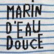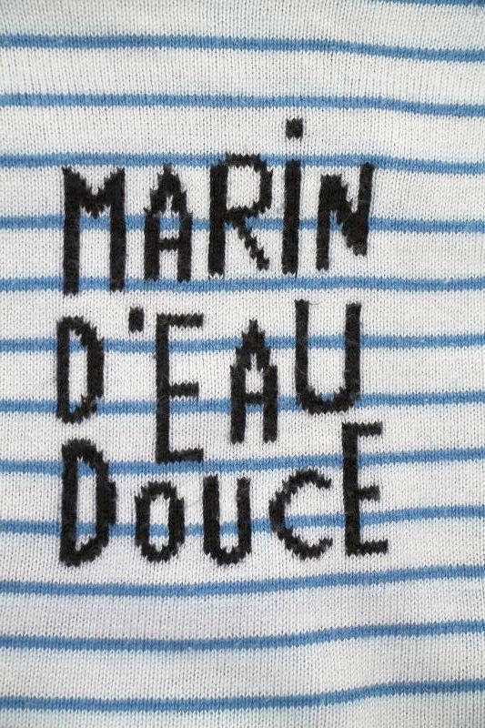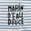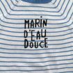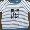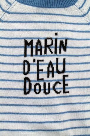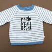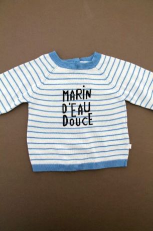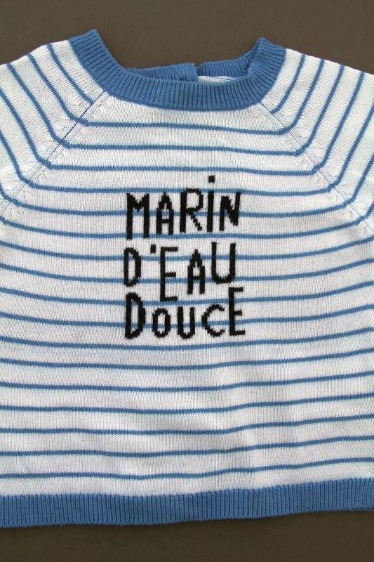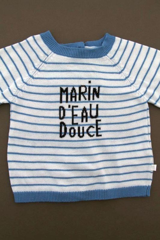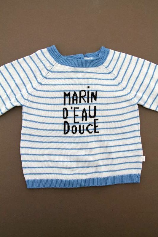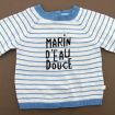 Pull en tricot fin doux gris clair rayé marine et bleu canard, pour bébé garçon 6 mois, chaud pour la mi-saison, avec 3 boutons sur la poitrine pour faciliter l'enfilage.