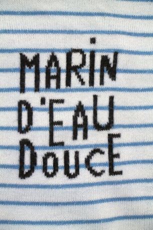 Pull à capuche en tricot fin bleu ciel bord bleu roi et blanc, pour bébé garçon 6 mois, avec broderie "J" côté coeur et 3 boutons sur la poitrine pour faciliter l'habillage.