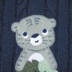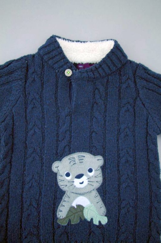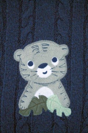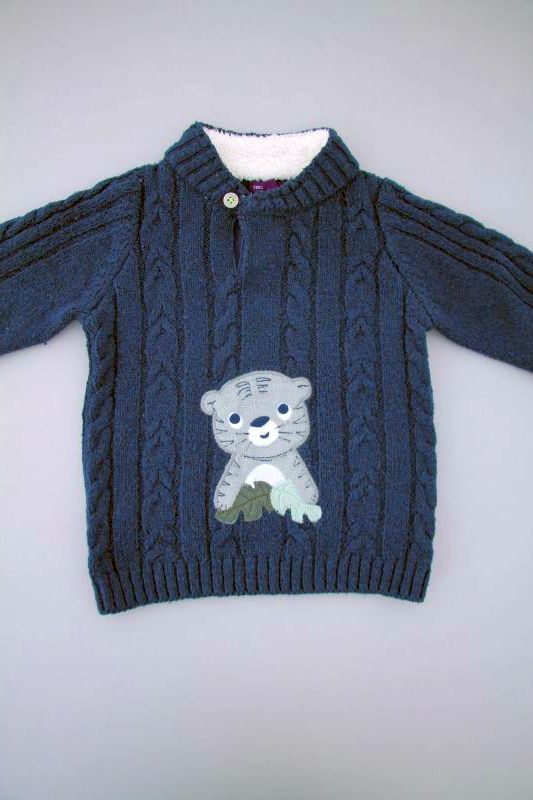 Pull en tricot bleu marine foncé rayé kaki, pour bébé garçon 12 mois, chaud pour l'automne ou l'hiver, avec écusson brodé côté coeur et 2 boutons sur la poitrine pour faciliter l'enfilage...