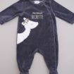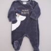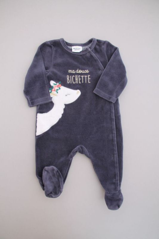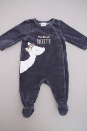 Pyjama en velours bleu marine, pour bébé fille 6 mois, avec col claudine et pieds en popeline de coton à pois blancs et pressions au dos.