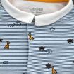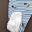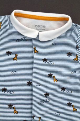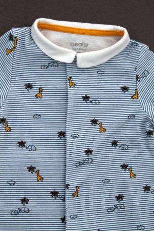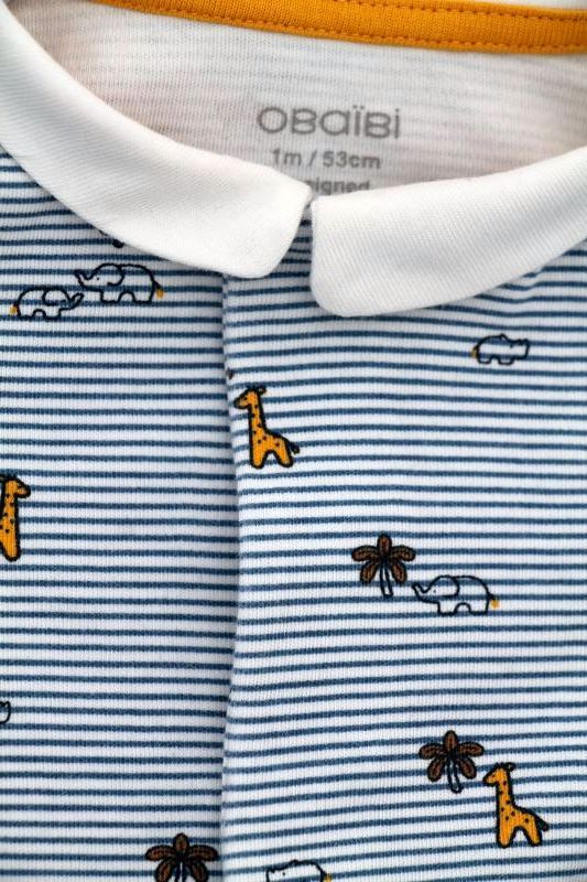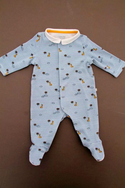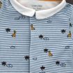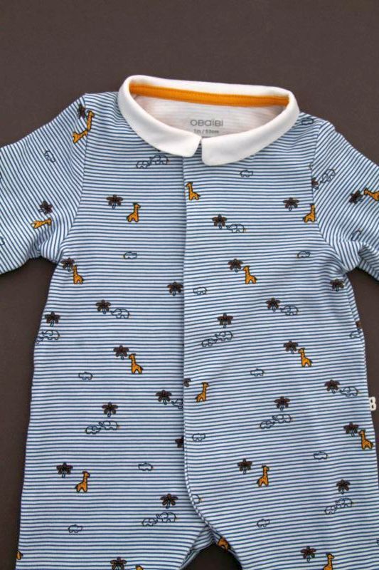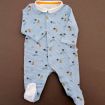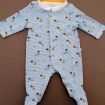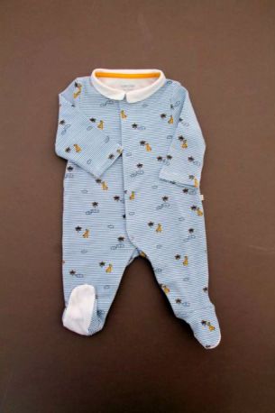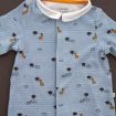 Pyjama en jersey de coton fin gris clair chiné imprimé bateaux, pour bébé garçon 1 mois, léger pour les nuits chaudes de l'été, avec pressions dans le dos.