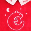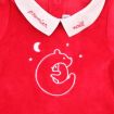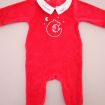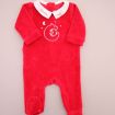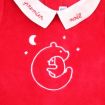 Dors-bien mixte en velours rouge, pour bébé 1 mois, avec col blanc en popeline de coton brodé "premier Noël", broderie sur la poitrine et pressions au dos.