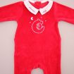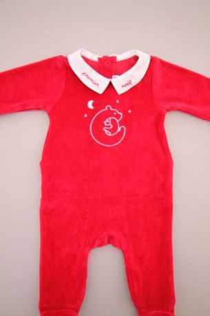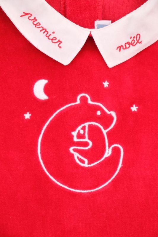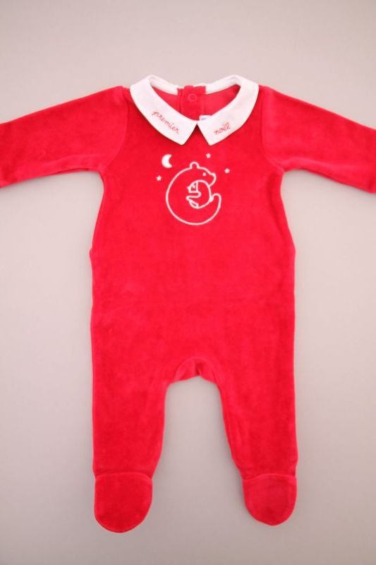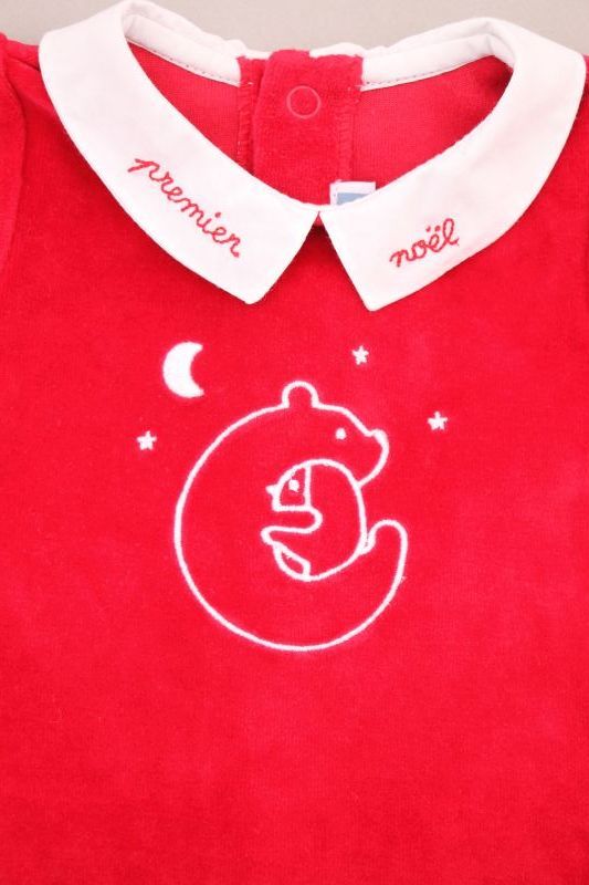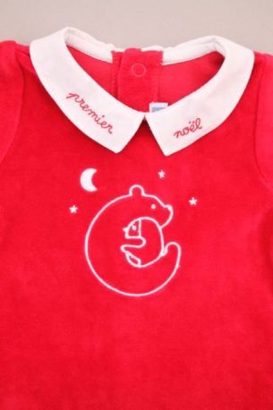 Pyjama mixte en velours doux rouge foncé, pour bébé 1 mois, avec col blanc en popeline de coton brodé "premier Noël", broderie sur la poitrine et pressions au dos.