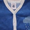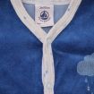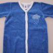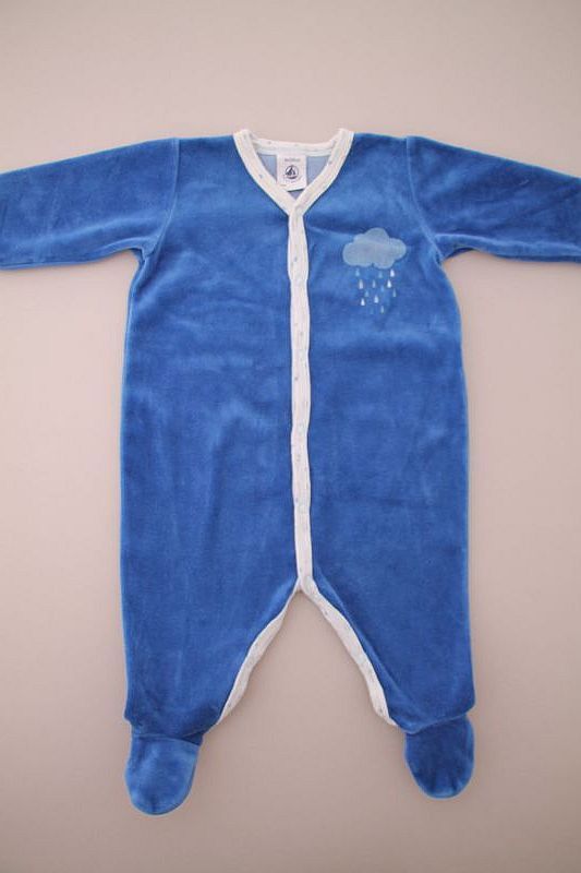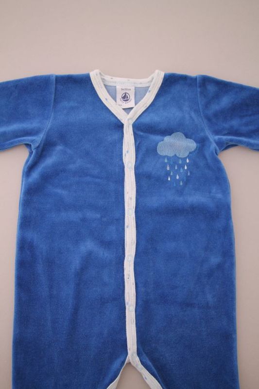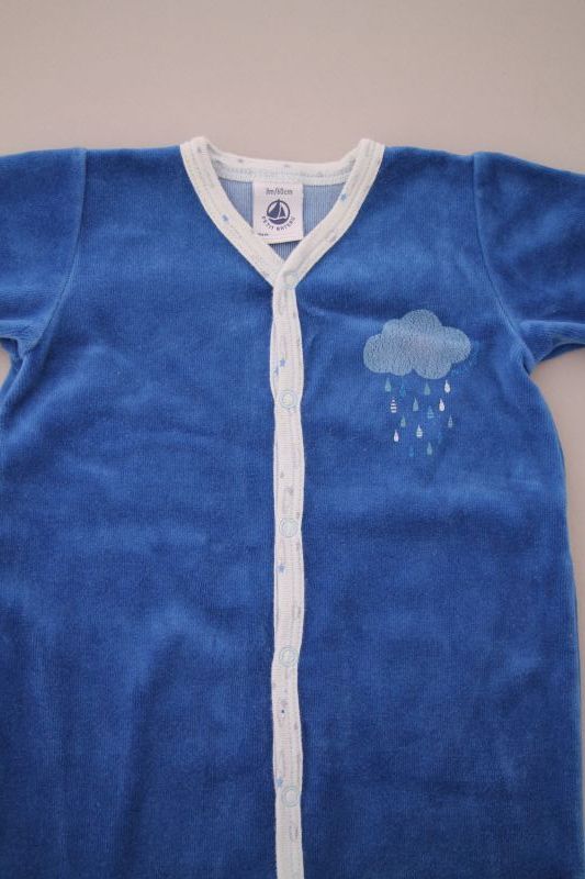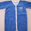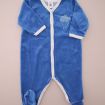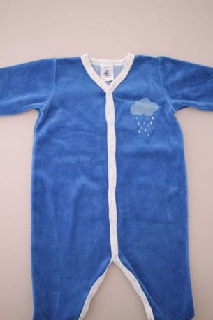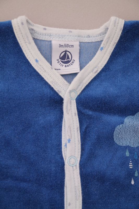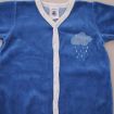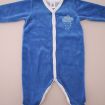 Pyjama en velours doux bleu layette, pour bébé garçon 3 mois, chaud pour l'hiver ou la mi-saison, avec bord en jersey milleraies bleu marine, motif sérigraphié sur la poitrine et pressions au...