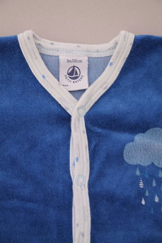 Pyjama en velours gris clair, pour bébé garçon 3 mois, chaud pour l'hiver ou la mi-saison, avec bord en jersey milleraies bleu marine, motif sur la poitrine et pressions au dos.
