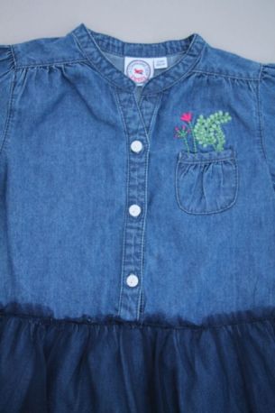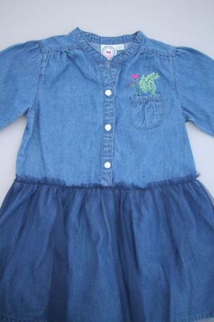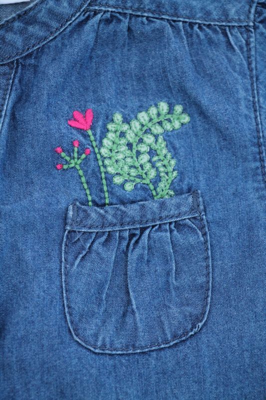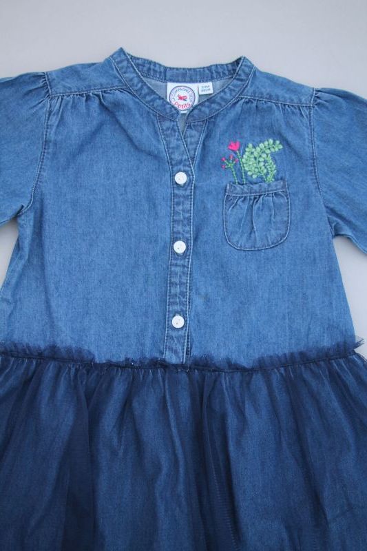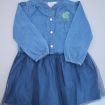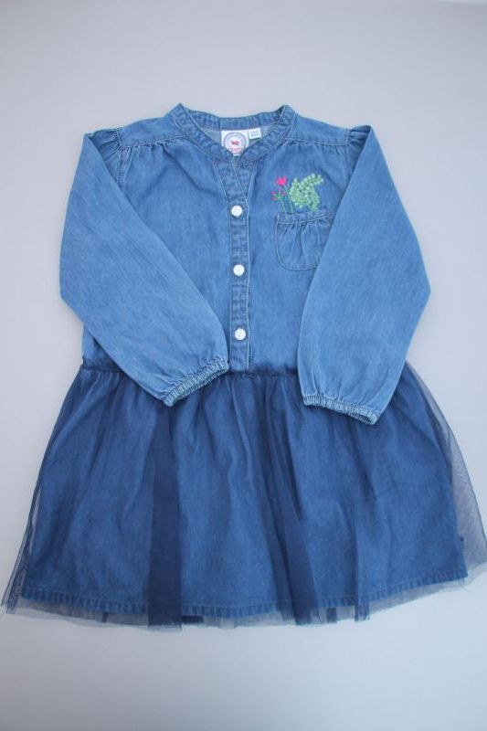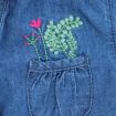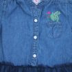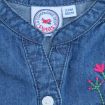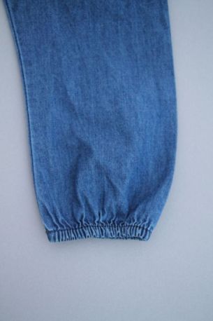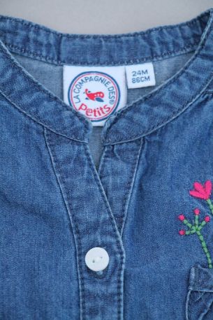 Salopette longue en jean élasthanne bleu, pour bébé fille 24 mois, idéale pour le printemps ou la mi-saison, très souple et confortable à porter, avec bretelles volantées et pressions entre...