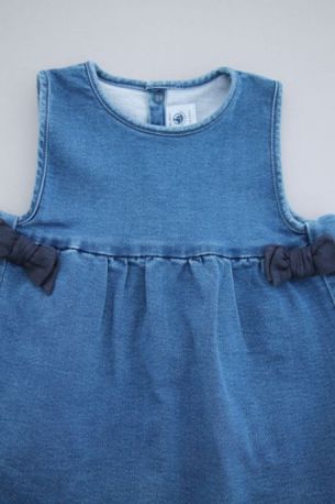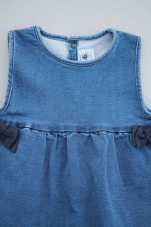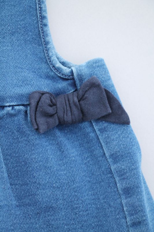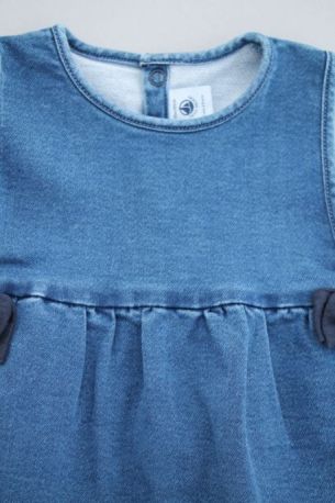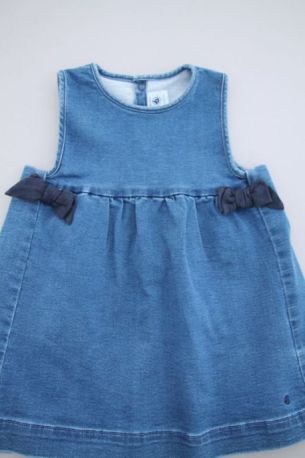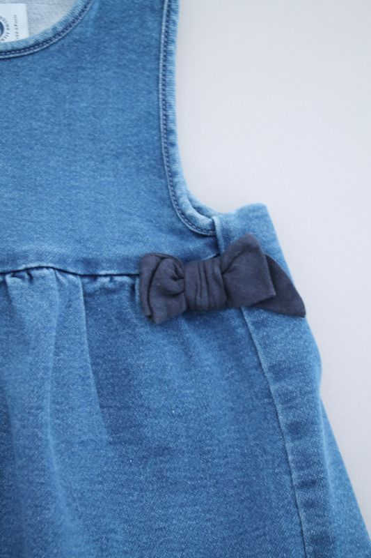 Robe à bretelles en denim stretch bleu jean, pour bébé fille 18 mois, idéale pour le printemps, l'automne ou la mi-saison, très souple et confortable à porter, avec bretelles pressionnées...