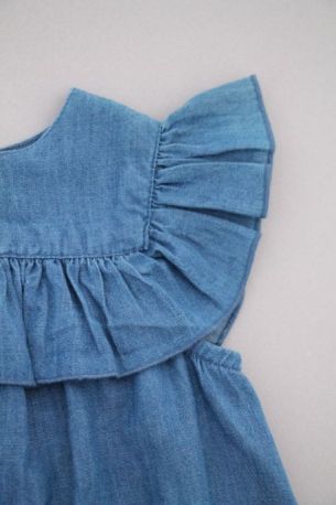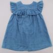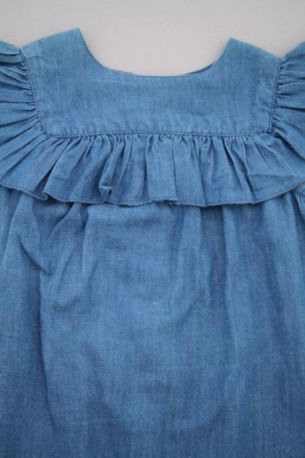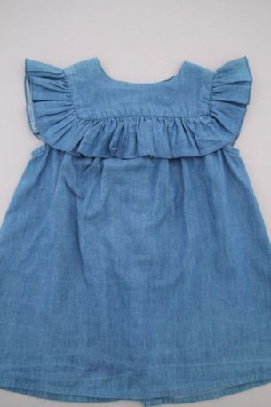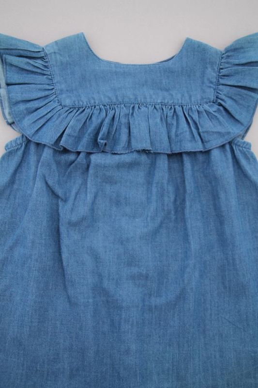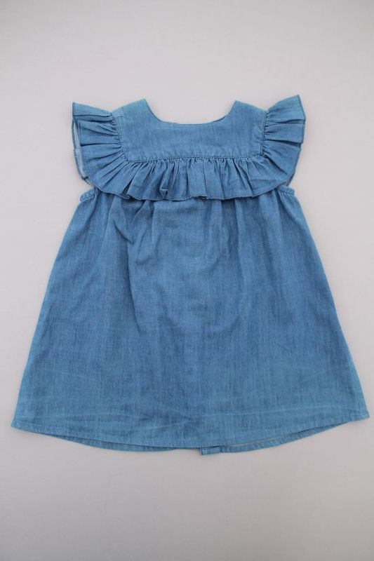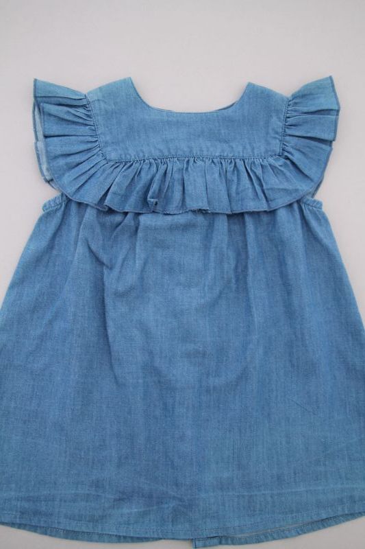 Robe chambray bleu clair à col claudine et manches ballon, pour bébé fille 6 mois, très légère pour le printemps ou l'été, avec fleurs brodées sur les poches, broderie sur le col et les...
