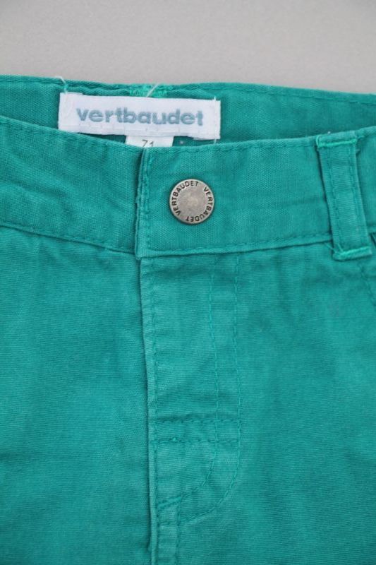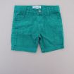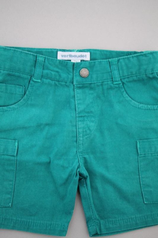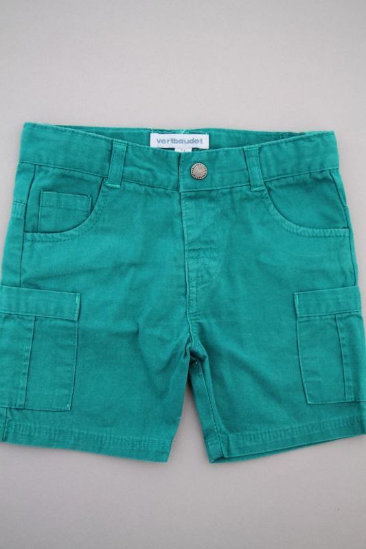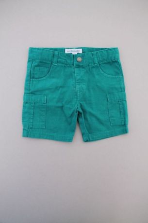 Bermuda en coton fin vert, pour bébé garçon 9 mois, léger pour le printemps ou l'été, avec taille ajustable avec élastique réglable et un bouton-pression devant.