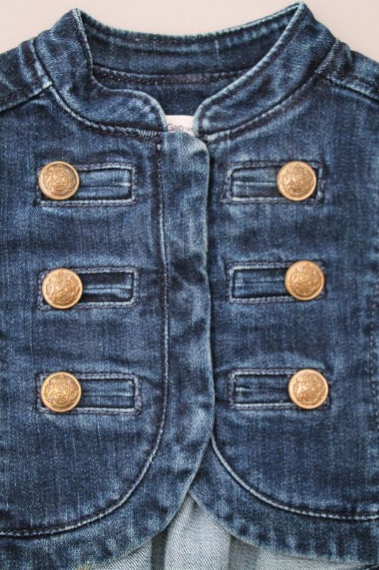 Veste en jean souple, pour bébé fille 12 mois, idéale pour le printemps ou l'été, avec broderie sur la manche droite et fermeture par 5 boutons.