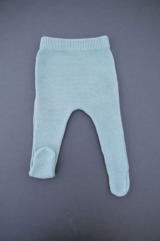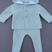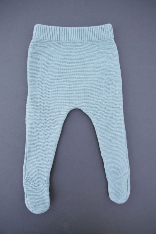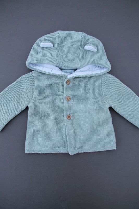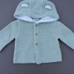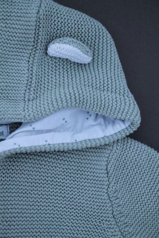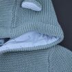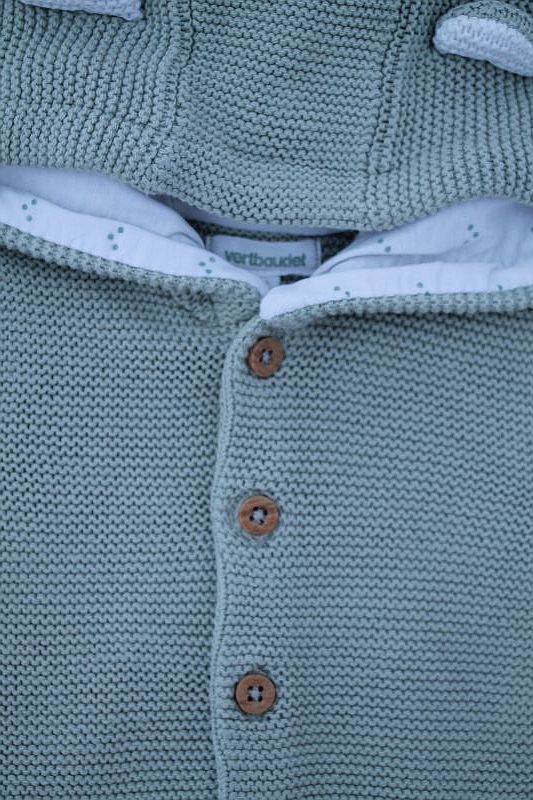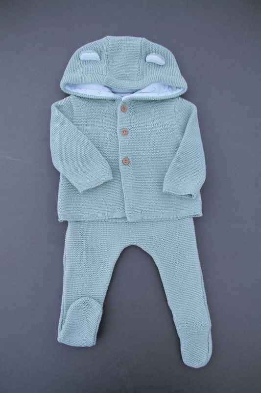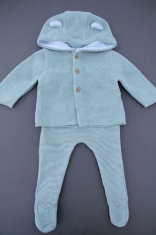 Ensemble mixte en tricot point mousse vert amande, pour bébé 3 mois, idéal pour la mi-saison ou le printemps, comprenant une veste avec capuche doublée et un legging avec pieds assorti...